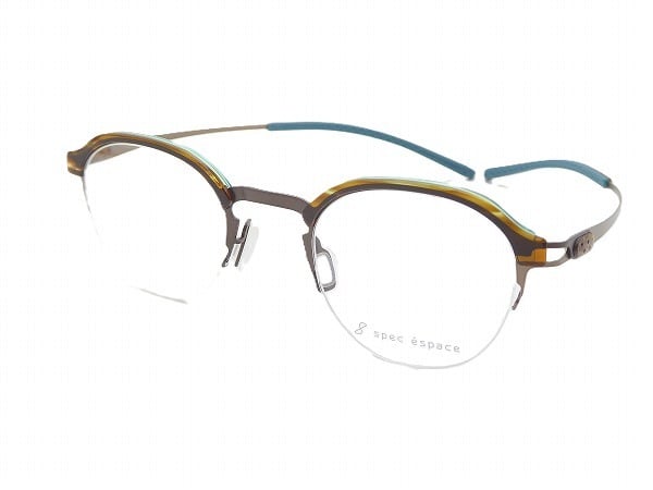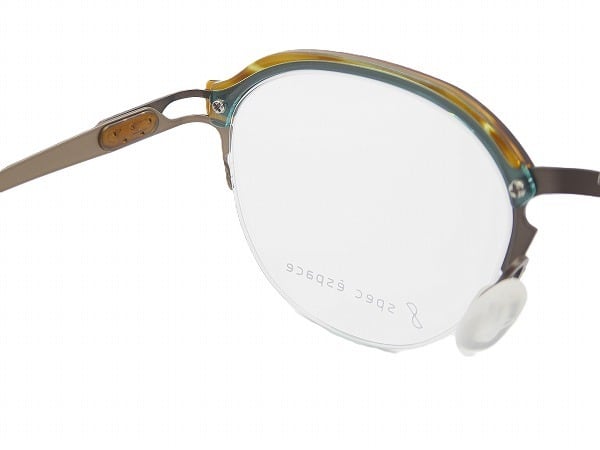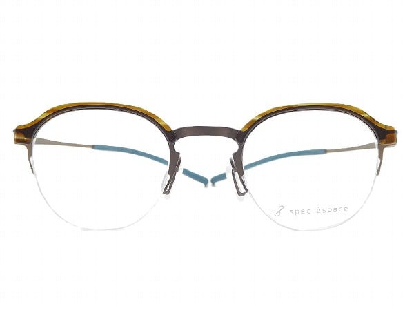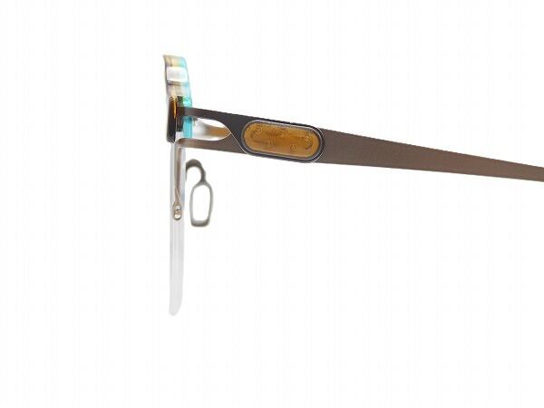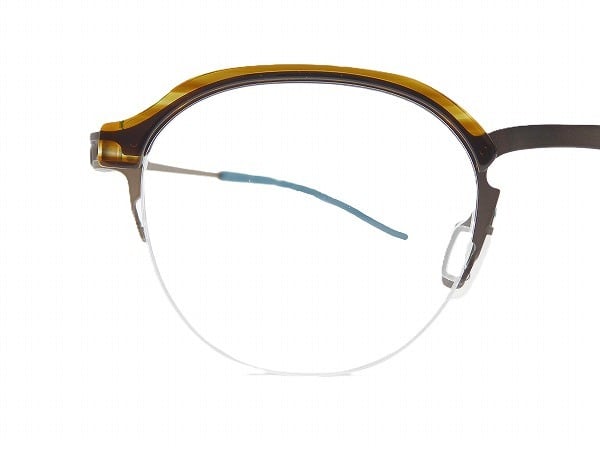 2枚のシート状チタンで構成されたヒンジレスフレーム。上部のブローがよいアクセントで、下リムをナイロールで仕上げた「ボストンシェイプ」のメガネ。ネジ・溶接を使用しないミニマルなデザインは、スマートでモードな印象を与えます。