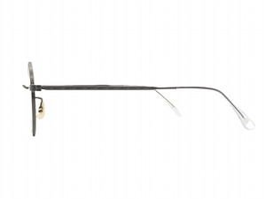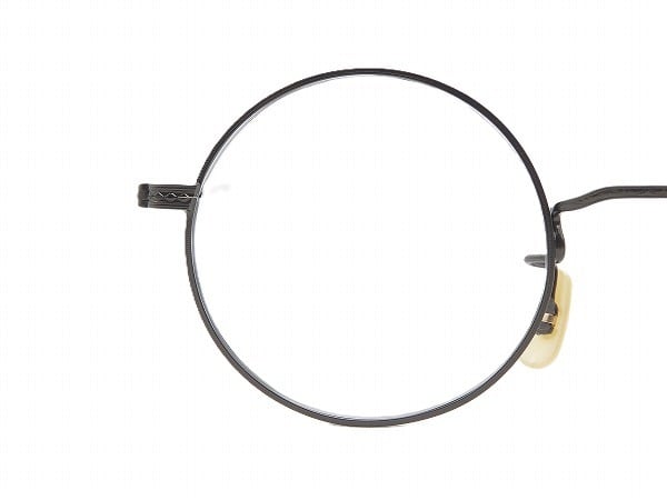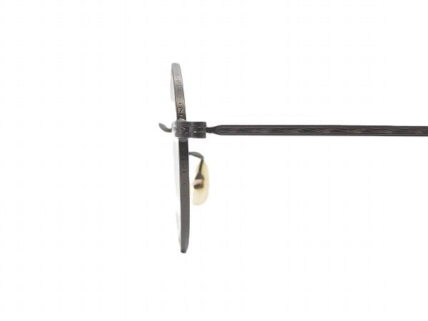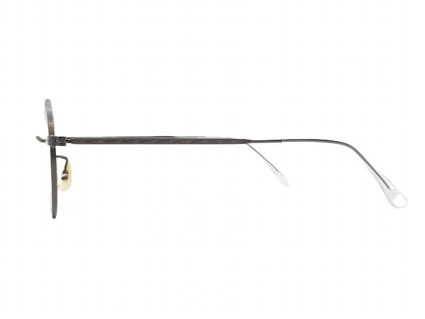 細身で小ぶりなラウンド型のサンプラチナフレーム。リム上面やテンプル外側に彫金を施したヴィンテージ感のある趣きに仕上げています。モダンなトラッドスタイルに合わせたい眼鏡です。
